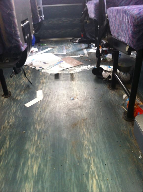 バスの中に、食いカスや、飲んだ後のペットボトルが散乱している。