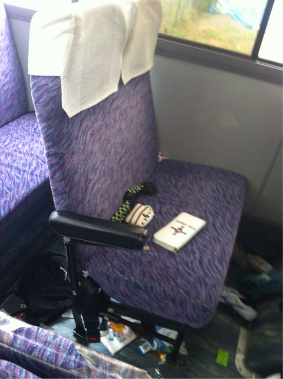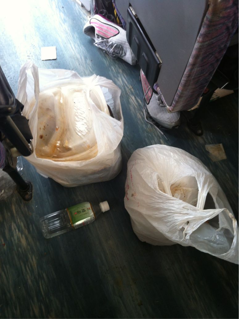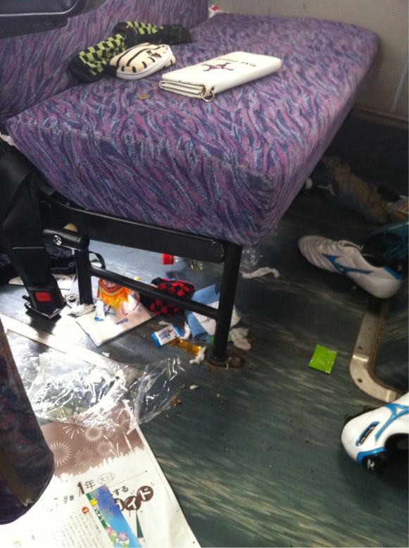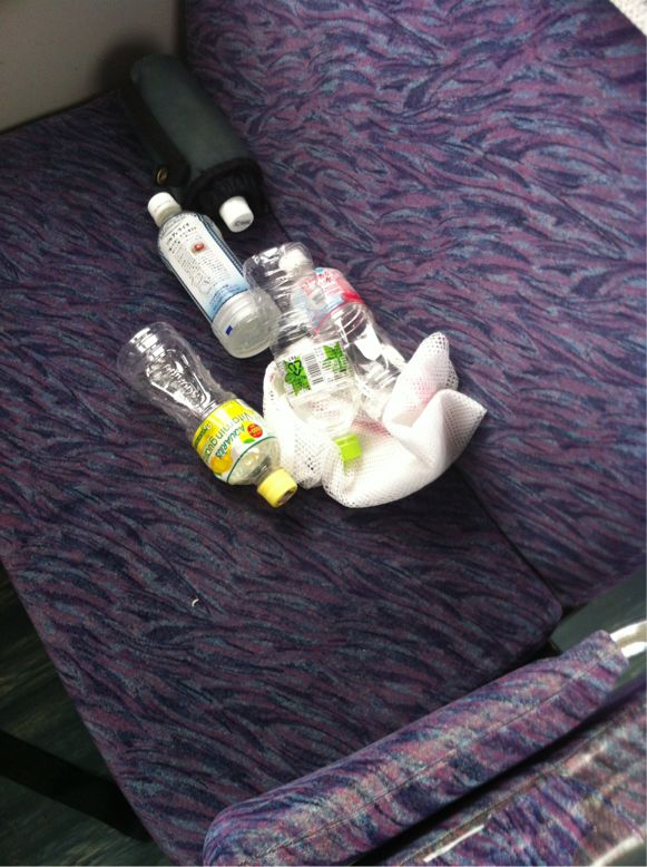バスの中に、食いカスや、飲んだ後のペットボトルが散乱している。